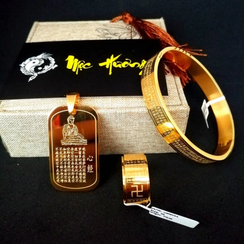 Combo Bộ 3 Nhẫn + Vòng + Mặt bát nhã tâm kinh chính hãng mạ vàng 24k - Bảo hành 2 năm không bay màu. - Nhẫn được làm từ Titan mạ vàng 24k siêu bền và cứng cáp. - Chống xước và...