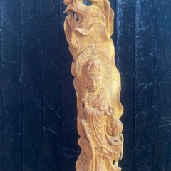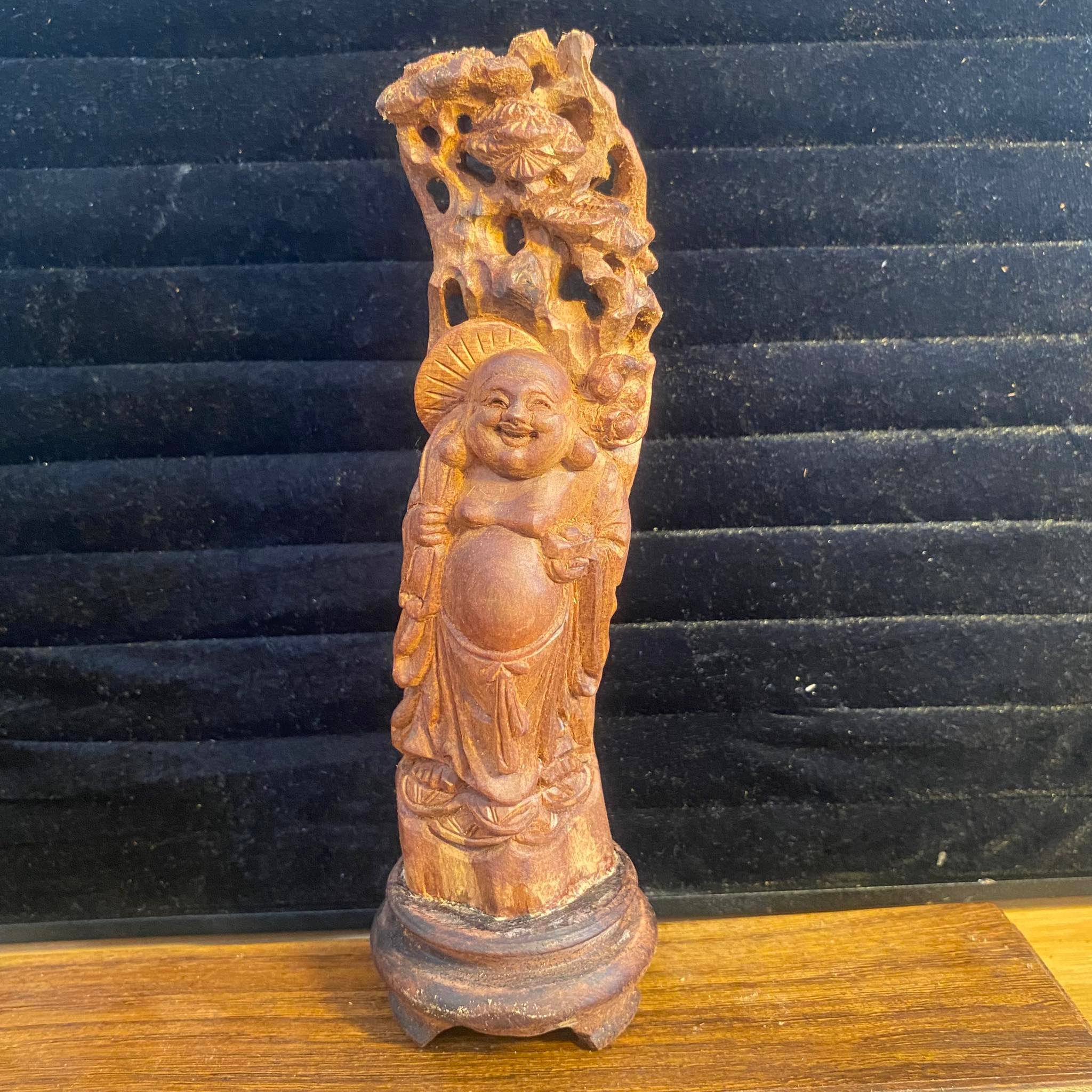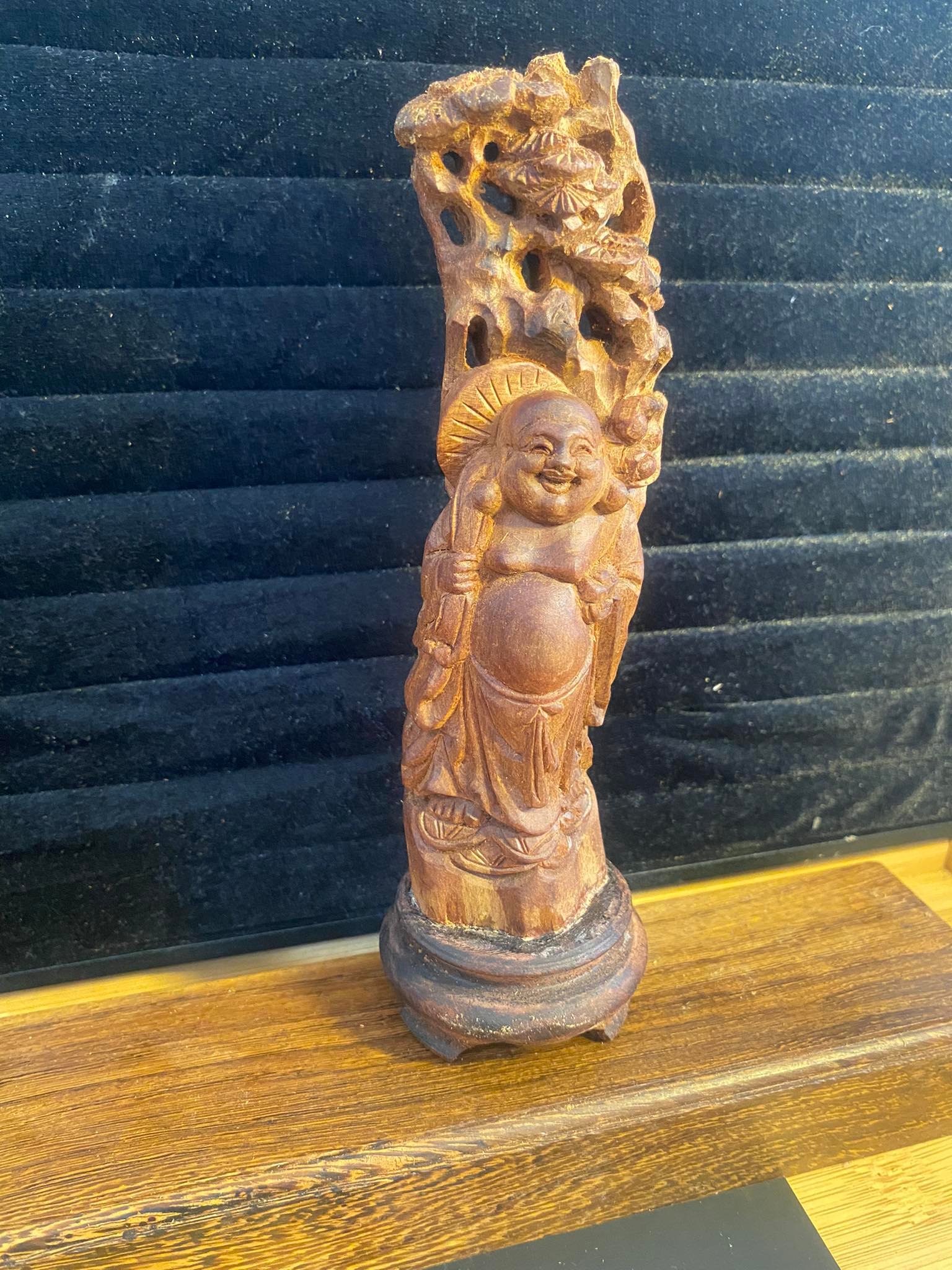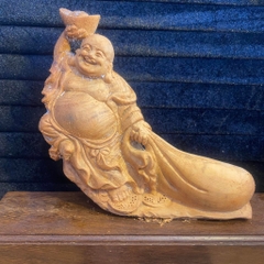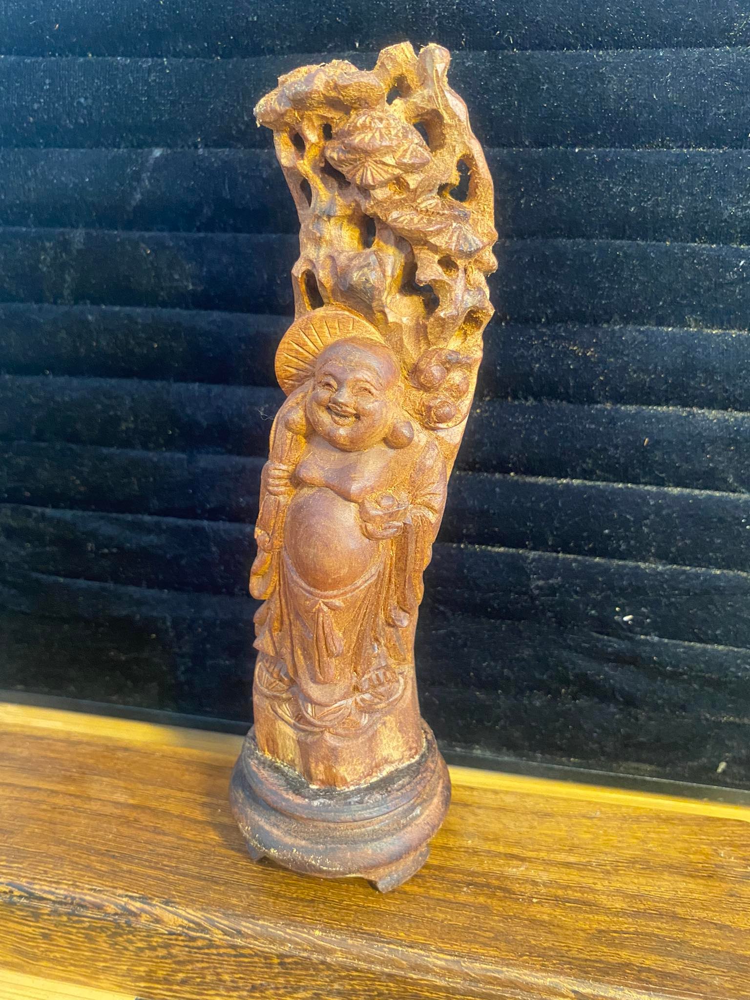 Tượng di lặc đứng gốc tùng gỗ hoàng đàn tuyết thơm ngọt