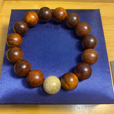 Vòng Gỗ Sưa Đỏ 14mm Mix San Hô Hóa Thạch Trắng