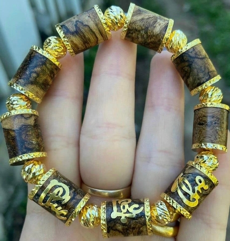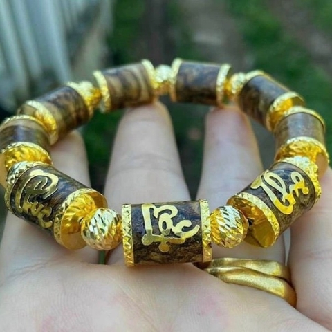 Vòng gỗ Trầm Hương tốc kiến tự nhiên bọc vàng 18k mix bi vàng